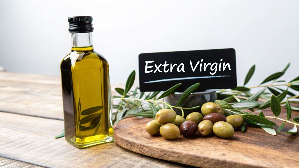 When you see "extra virgin" on a bottle, it’s not just marketing fluff. Think of it as an Olympic gold medal for olive oil—it's a hard-won grade that signifies the absolute peak of quality. This isn't a title given out lightly; it’s a promise of purity, earned only after passing a tough, two-part trial covering both chemical and sensory standards.