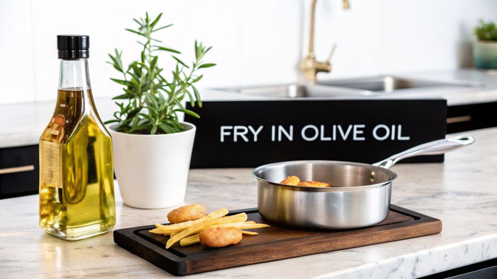 Keep a vigilant eye on that temperature, especially between batches. It is absolutely essential to let the oil climb back up to your target temperature before adding the next round of food. This single act of patience makes all the difference. To dig deeper into how olive oil performs under fire, our guide on olive oil for high-heat cooking has more detail.